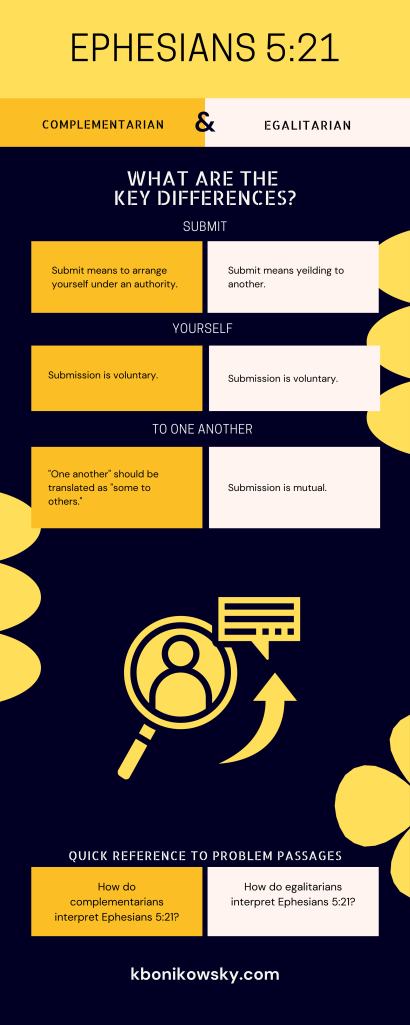 Ephesians 5:21 is a general call for all Christians to live a submissive life as a result of being filled with the Holy Spirit (5:18). This verse introduces a section instructing the Ephesians how to behave in their homes. Complementarians and Egalitarians differ in their interpretation of this verse in three ways.