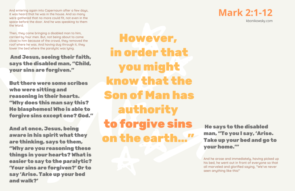 Jesus, calling himself “the son of man,” uses his divine authority not to demand obedience and to amass power, but to forgive. This is the profound reality of the incarnate contradiction. All the Gospel writers title Jesus “the son of God” and “the Christ,” but Jesus calls himself by the title that euphemistically means, “The Human.” Jesus has been given divine authority as the son of God, yet he identifies as a free human agent. Jesus is a human who forgives like God does.